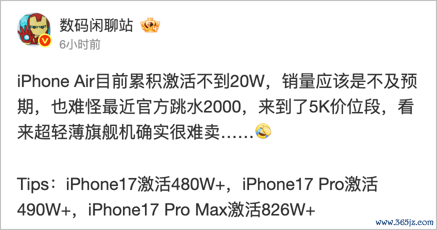 根据博主@数码闲聊站的最新消息,iPhone Air 目前在国内的累计激活量还不到 20 万台。作为对比,同期的 iPhone 17 系列表现堪称恐怖: